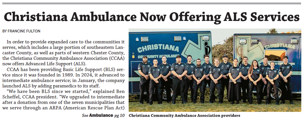 | The Christiana Community Ambulance Association (CCAA) has been a trusted EMS provider in the municipalities we serve since 1989. Located in a unique region along the border of Lancaster and Chester counties, CCAA has consistently delivered high-quality, pre-hospital care when time matters most.